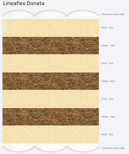 Одна из самых долговечных и надежных моделей от российского бренда «Линия Флекс» – жесткий матрас Donata. Обладает анатомической памятью и без труда подстраивается под контуры тела человека. Наполнитель сочетает в себе кокосовую койру и пену эргофлекс. Высота составляет 21 см. Благодаря новейшим итальянским технологиям, которые применяются на производстве, матрас полностью защищен от слеживаний и продавливаний, что увеличивает срок его службы на долгие годы. Высокий уровень комфорта прослеживается и в материале, из которого выполнен чехол. Это мягкий, дышащий и очень приятный к телу – хлопковый жаккард. Стежка изготавливается из файбера. Рекомендуемый вес при эксплуатации – до 140 кг.