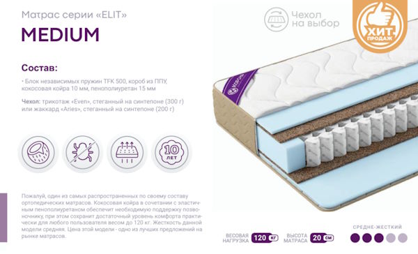 <comment>Купил матрас Элит Медиум для замены старого, который стал терять форму и доставлять дискомфорт. Выбор пал именно на эту модель благодаря сочетанию средней жесткости и качественных материалов. Параметры матраса идеально подходили для моей кровати: размер 160х200 см оказался стандартным и легко вписался в спальню. Матрас выполнен с отличным качеством: чехол из гипоаллергенного материала обеспечивает комфорт, а в качестве наполнителя использован современный пенополиуретан, который отлично распределяет вес. Весовая нагрузка до 120 кг на спальное место — это важный момент для меня, так как хотелось быть уверенным в надежности. Высота матраса 22 см оказалась удобной для стандартных простыней и создает комфортную высоту кровати.</comment>
