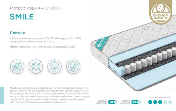 • Высота (Толщина): Беспружинные модели — от 16–18 см, матрасы с независимым блоком S-500/S-1000 — от 20–25 см.