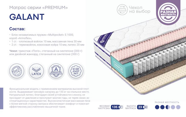• Высота (Толщина): Беспружинные модели — от 16–18 см, матрасы с независимым блоком S-500/S-1000 — от 20–25 см.