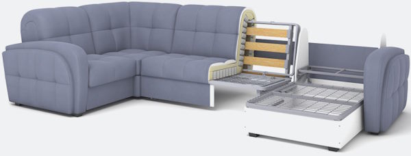 Огромный выбор размеров и типов модулей позволяет составить диван для любого помещения. На диване удобно сидеть и спать: механизм аккордеон при раскладывании образует высокое ровное спальное место, по комфорту сравнимое с настоящими кроватями. Все модули могут быть исполнены с матрасами ППУ или НПБ высотой 12 см (исключение угловая секция — только с НПБ).